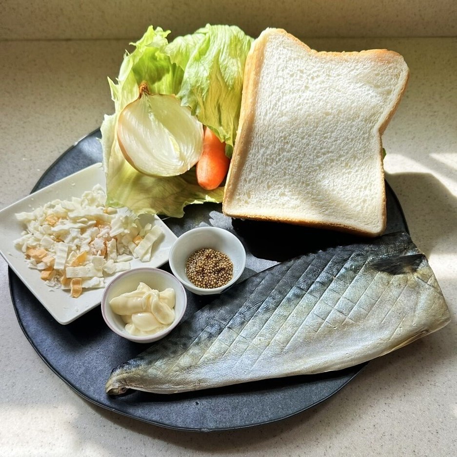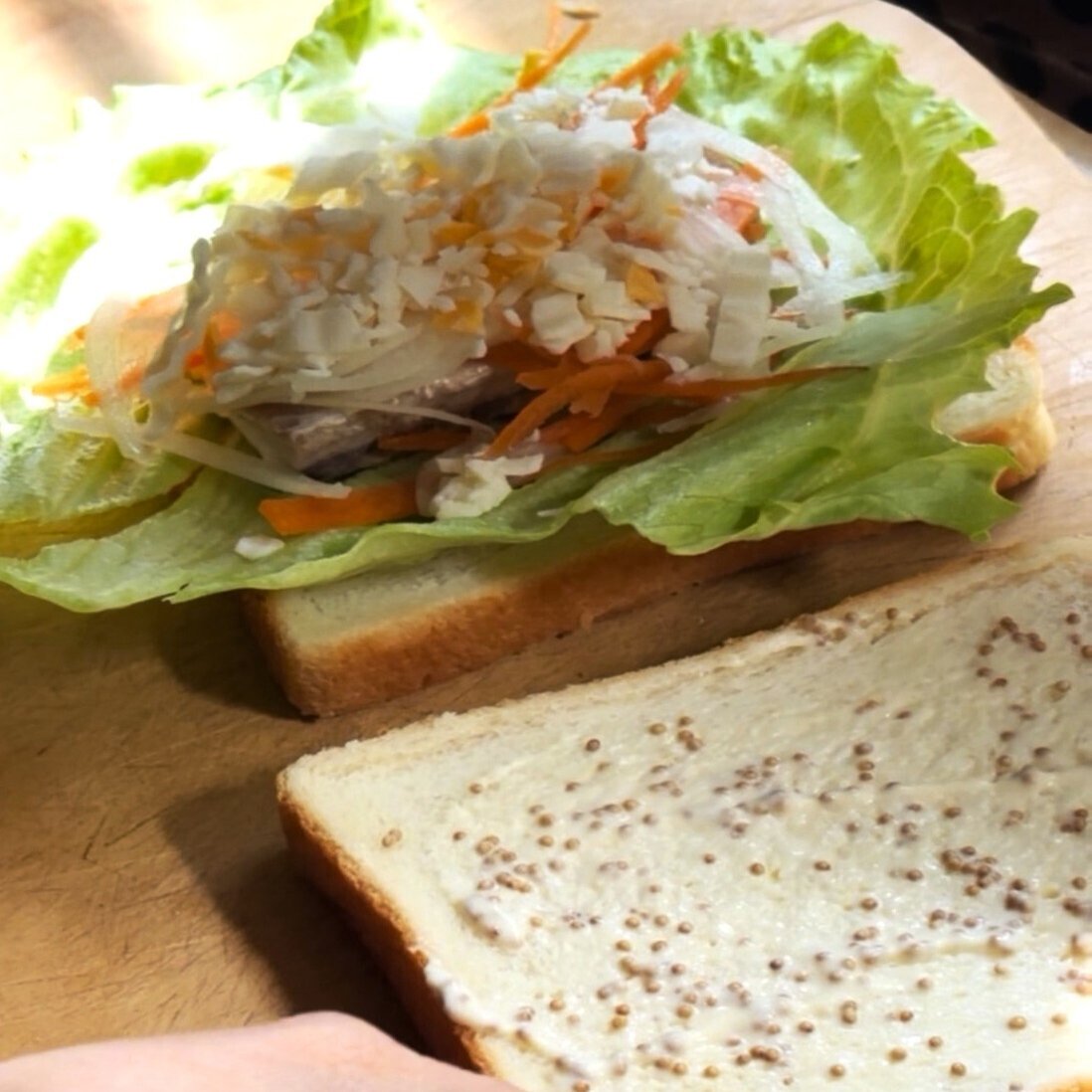 2.薫サバをフライパンで焼きます。マヨネーズと粒マスタードを混ぜ、食パンに塗ります。その上にレタス・薫さば2切・ニンジン・チーズ・食パンをのせます。