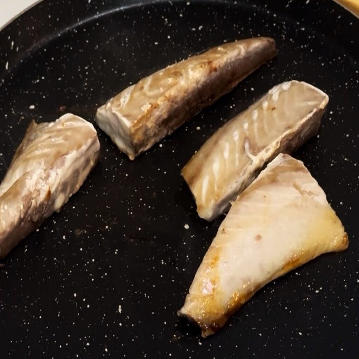 薫サバのカマ、腹骨、中骨を取り除き、4等分に切ります。