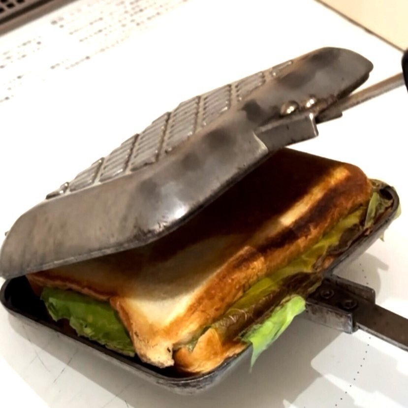 3.ホットサンドメーカーを温め、バターを塗り2をはさみ、中火で2分ほど焼き食パンに焼き目がついたらホットサンドメーカを返し2分ほど焼きます