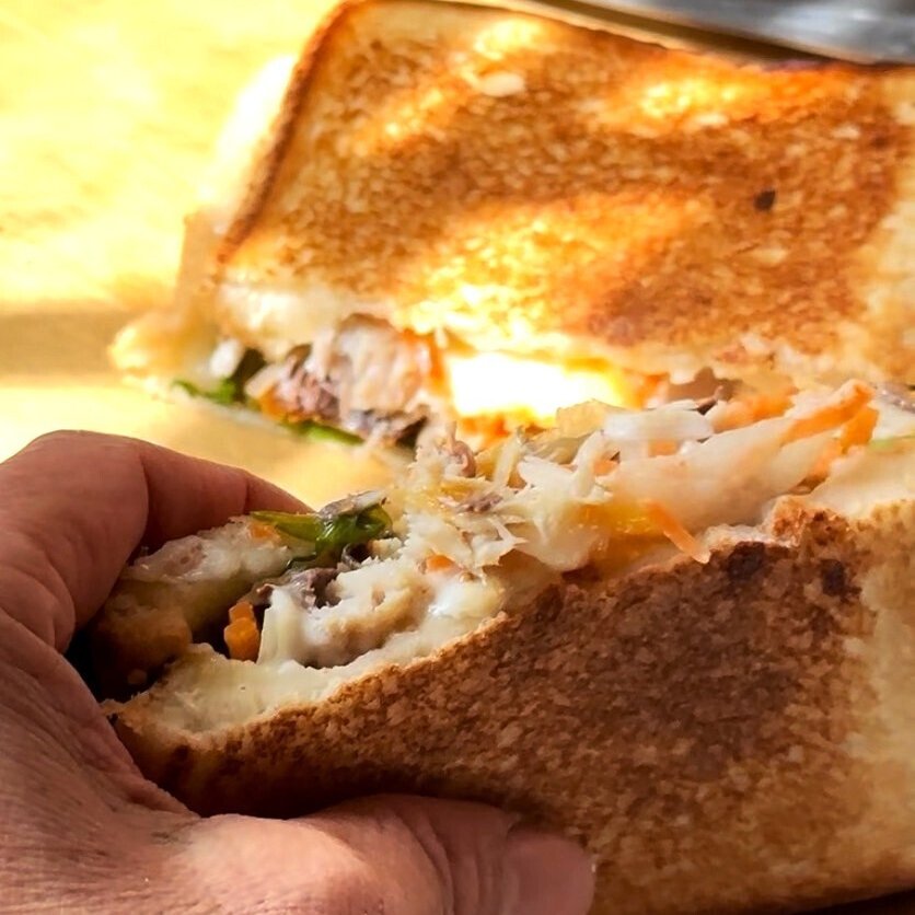 溶けたチーズが薫さばと野菜にからんだ「やみつきサンド」💕