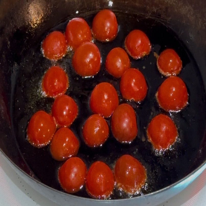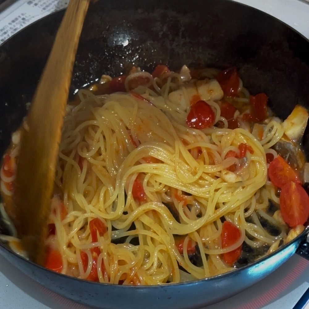 2.フライパンにオリーブオイルを多めに入れ少し温まったらニンニクを入れ香りがついたら取り出し、トマトの切り口を下にして入れフタをします。パスタを湯がき始めます。