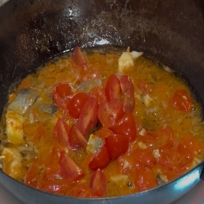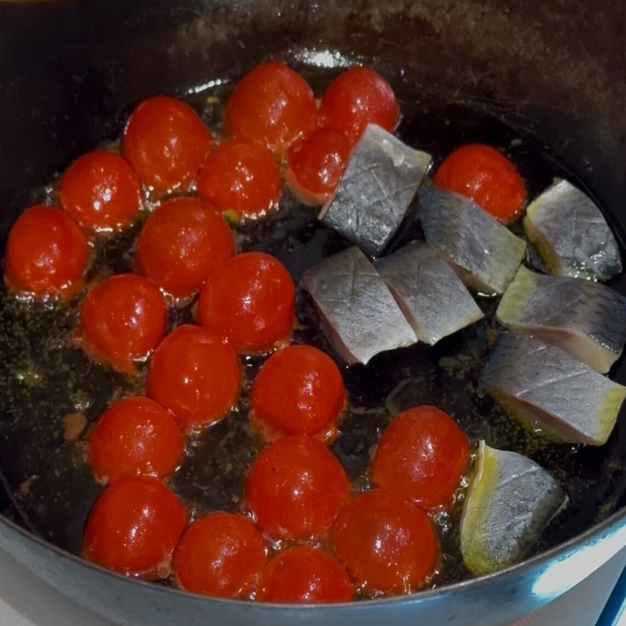 3.トマトがグツグツしてきたらニシンを入れ焼きます。