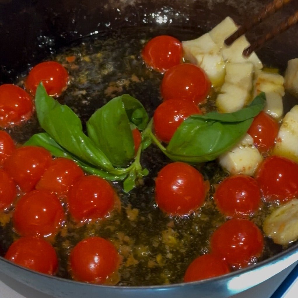 4.バジル3枚とパスタの湯がき汁を50~80cc加え煮込みます。