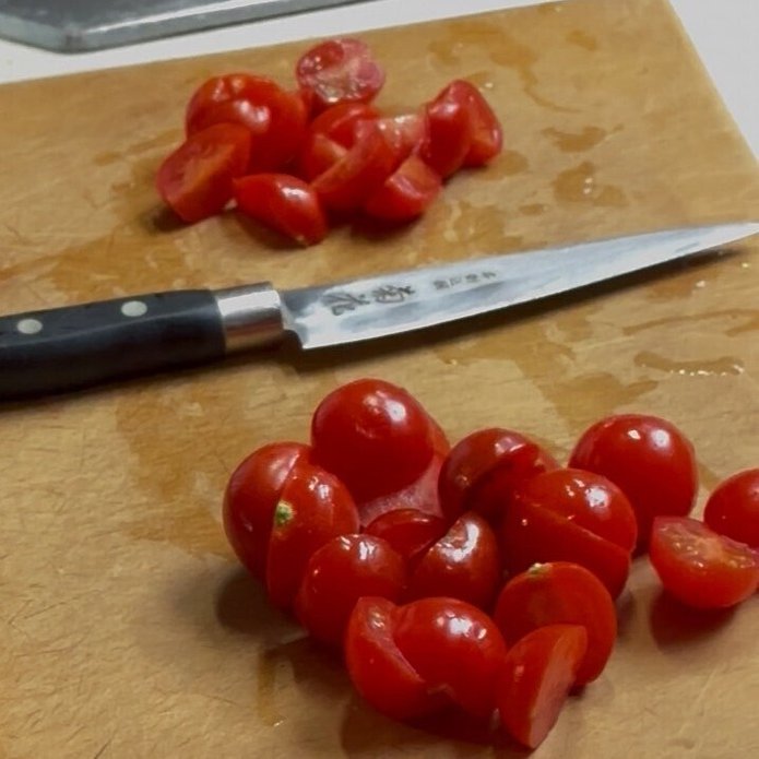 1.パスタ用のお湯を沸かします。ニシン干物を1センチ幅に切ります。ミニトマト4個を4等分に切り、残りは半分に切ります。ニンニクを薄切りにします。